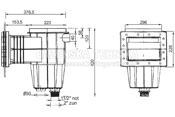 Web trgovina nudi slijedeće mogućnosti plaćanja: PPLAĆANJE PRILIKOM PREUZIMANJA PLAĆANJE PO PREDRAČUNU PREKO BANKE Skimmer ASTRAL 296 x 228mm - kratkiKratki skimmer ASTRAL, za liner bazene sa folijom, iz ABS materijala sa protokom 5000 l/h. Skimmer je u kompletu sa pričvrsnim okvirom i brtvama. Dimenzije: 296 x 228 mm Napomena: Skimmere je potrebno povezati sa filternim uređajem primjerenim PVC cijevima i spojnim materijalom, zato pogledajte još i rubriku : PVC spojni materijal Slični proizvodi |