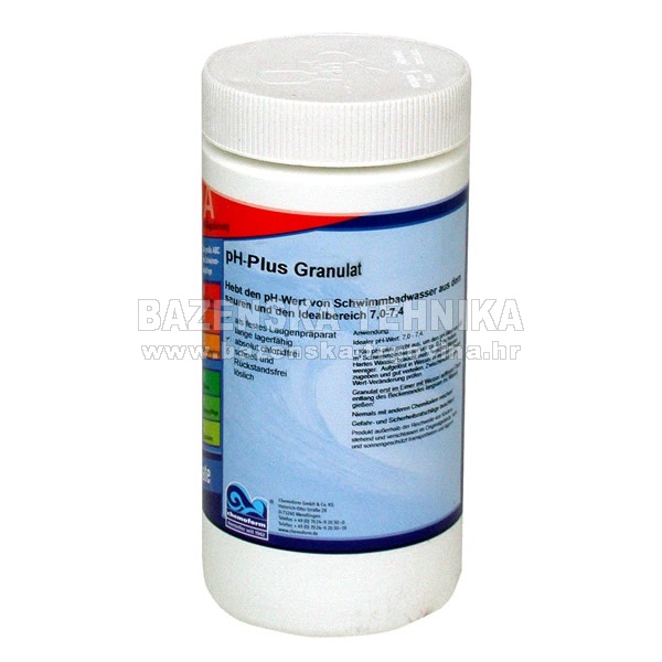 Web trgovina nudi slijedeće mogućnosti plaćanja: PPLAĆANJE PRILIKOM PREUZIMANJA PLAĆANJE PO PREDRAČUNU PREKO BANKE pH-plus granulat 1 kgVrlo koncentrirani preparat za povišavanje pH vrijednosti iz kiselog u neutralno područje kod bazena za plivanje. UPORABA: Sredstvo nikada ne smijete miješati sa drugim kemikalijama!